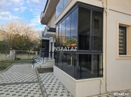 Şirkət125 Azn Şüşəbənd/pavilion – dekorativ fasadlı, panoramik şüşəli bağ evi - Memarlıq: klassik naxışlı portallı fasad, frontonda relyef bəzək elementləri, açıq rəngli daş/kompozit üzlük. - Şüşələnmə: 3 tərəfi boydan‑boya panoramik