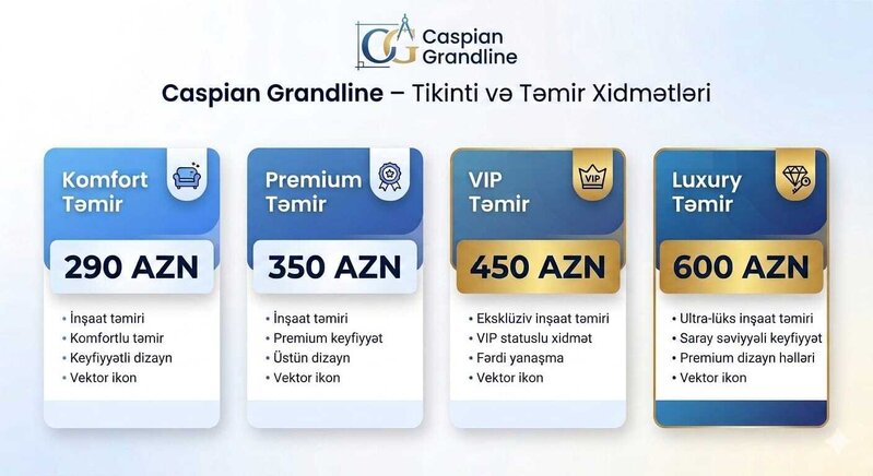 Şirkət ŞOK ENDİRİM - QAÇIRMAYIN! Caspian Grandline sizə möhtəşəm fürsət təqdim edir! Qaba tikinti işləri indi 250 AZN-dən başlayan ŞOK qiymətlə! Bazardakı qiymətlərdən daha sərfəli Keyfiyyət + sürət + zəmanət bir arada Məhdud