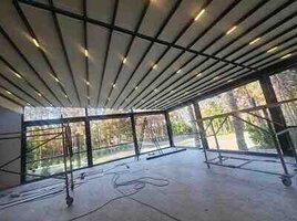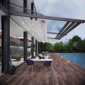 Şirkət100 Azn - Tavan: Alüminium lamellərdən ibarət bioklimatik konstruksiya; lamellər xətti şəkildə düzülüb, yağış suyu yönləndirmə kanalları ilə inteqrasiya olunur. - İdarəetmə: Avtomatik açılıb-bağlanma və bucaq tənzimlənməsi üçün
