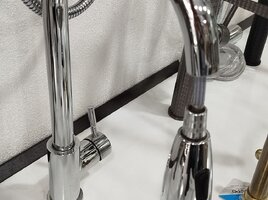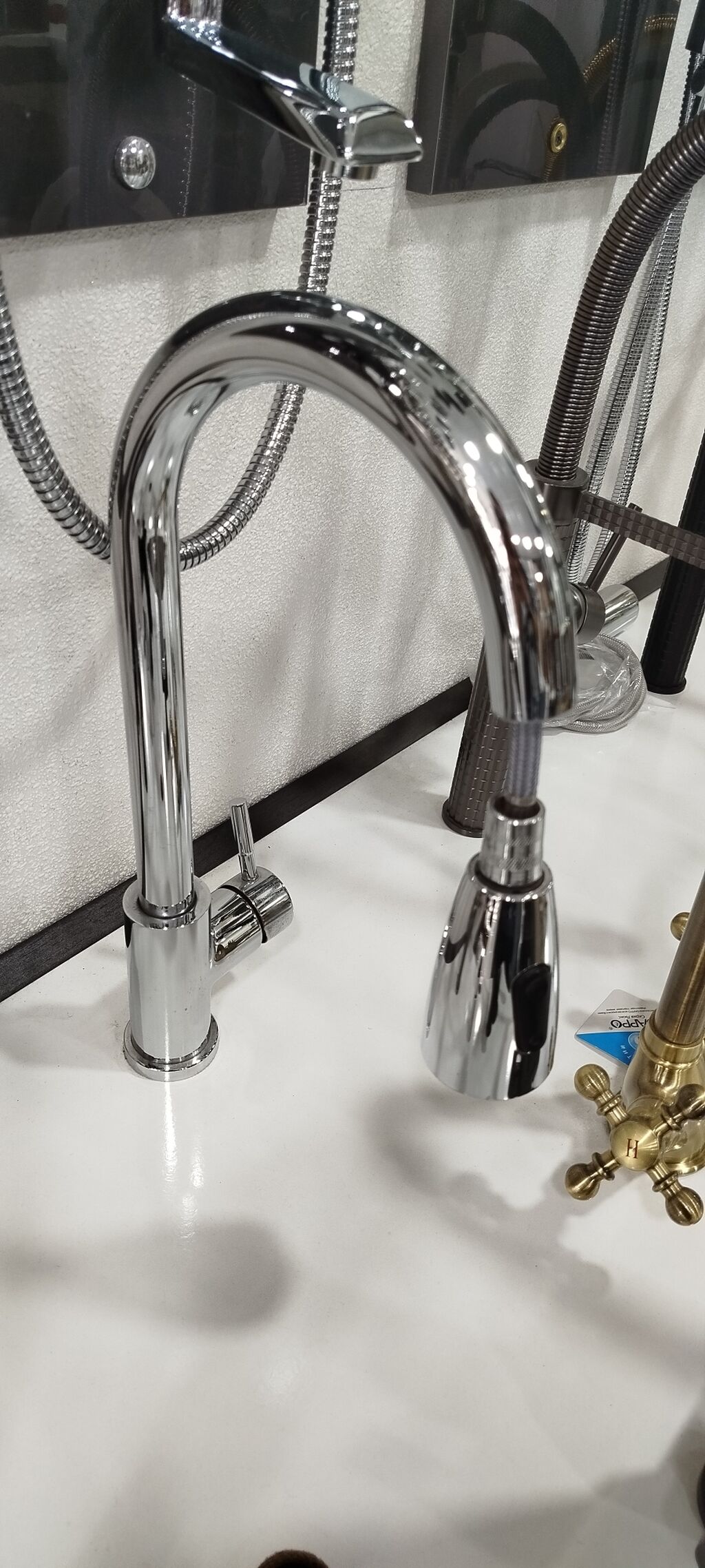 Mağaza220 Azn Qızılı rəngli mətbəx qarışdırıcı kran - Material: metal gövdə, parlaq qızılı örtük - Dizayn: yüksəksaplı U-forma; silindrik bədən və teksturalı (naxışlı) səth detalı - Çevik hortum: spiral formalı elastik boyun