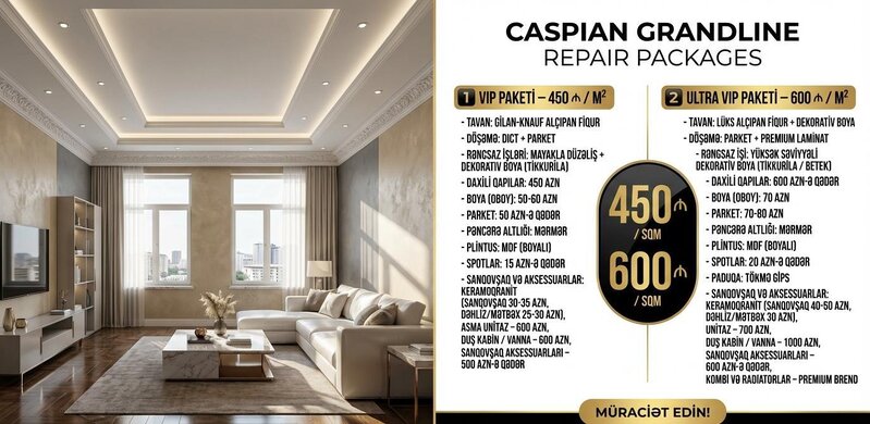 Şirkət350 Azn Yeni mənzil almısınız? Büdcənizi aşmadan, sürətli və keyfiyyətli təmir axtarırsınız? Caspian Grandline-ın "Smart Start" paketi ilə tanış olun! Cəmi 45 iş gününə açar təslim təmir. Keyfiyyətli materiallar və