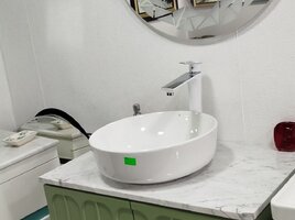 - Lavabo: parlaq ağ, yuvarlaq qab lavabo (üst-oturulan), ortada klik-klak tipli drenaj üçün yuva.