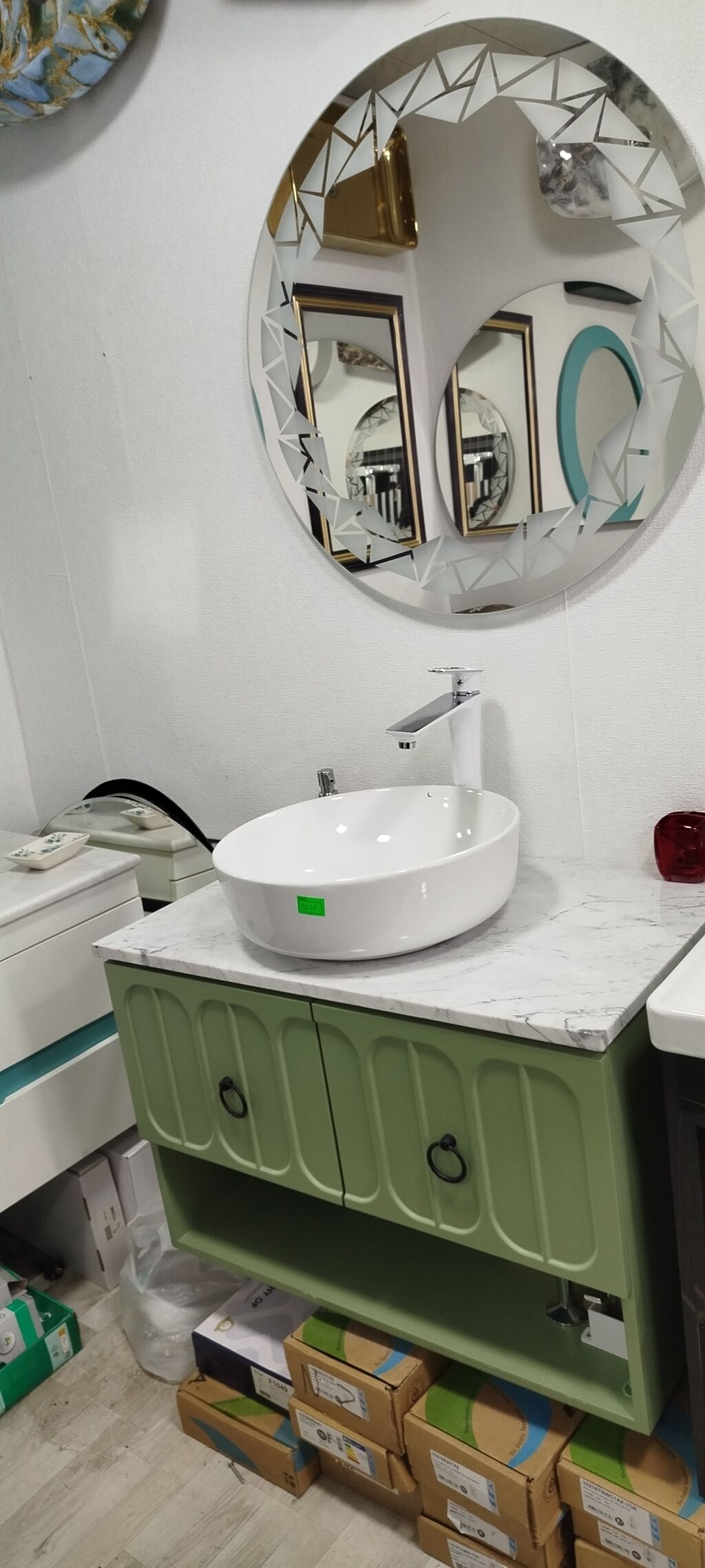 - Güzgü: böyük dairəvi güzgü, kənarlarında mat-şəffaf üçbucaq naxışlı dekor.